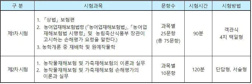 1차 시험은 객관식(4지 택일형)으로 구성되며, 농업재해보험의 기본 개념과 법률 지식을 평가합니다.