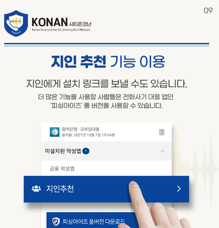 지인추천기능을 활용하여 내가 알리고 싶은 사람에게 추천하여 보이스피싱을 예방할 수 있게 할 수 있습니다.