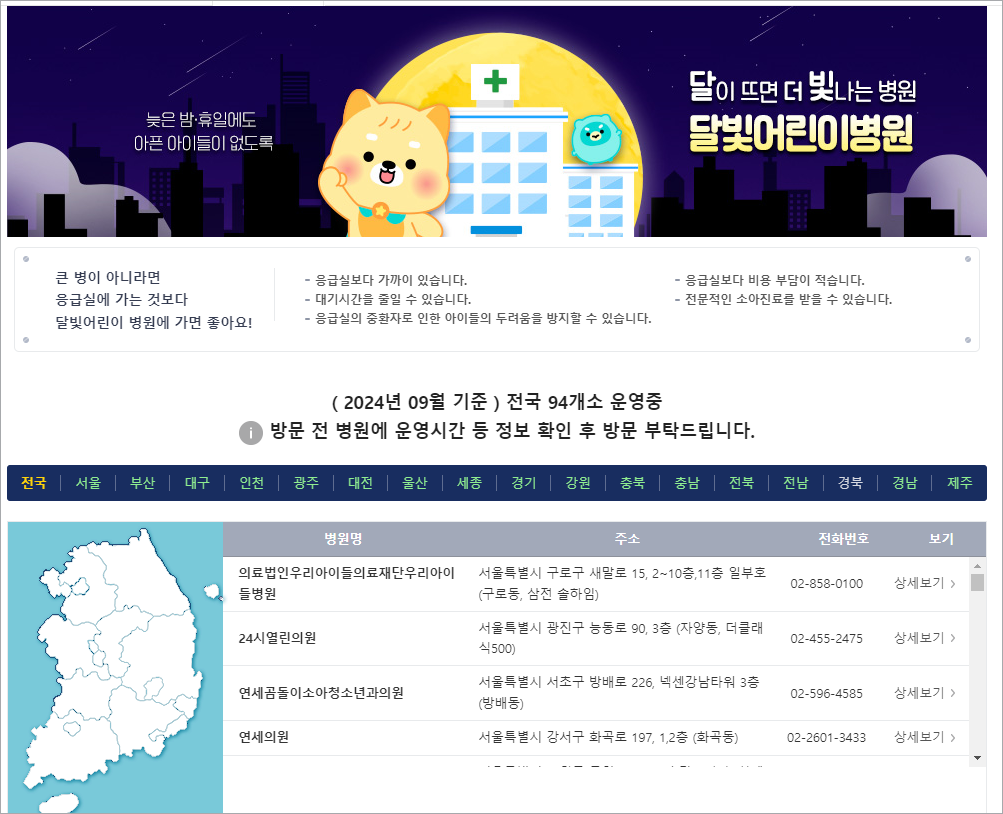 달빛 어린이 병원은 전국에서 운영되고 있습니다.
